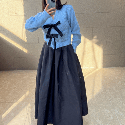 - 알파카 리본 꽈배기 V넥 니트 가디건